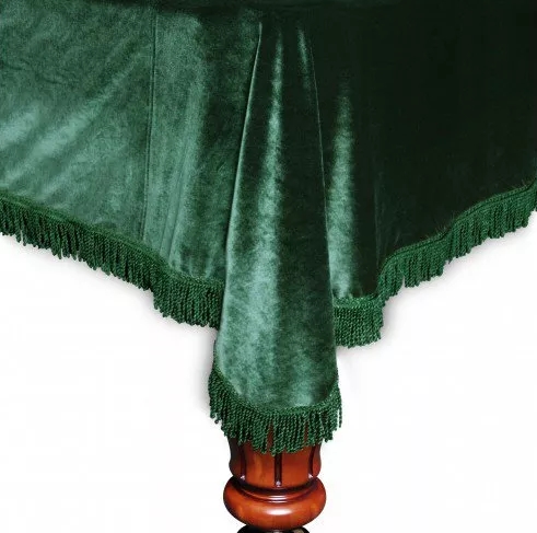 Данный чехол изготовлен из бархата без влагостойкой пропитки, так же на нём есть бахрома по краю. Ухаживать за бильярдным столом довольно легко, но уход подразумевает под собой постоянное приобретение дорогостоящих чистящих средств, а также в этом деле важна внимательность. Следует регулярно очищать бильярдный стол от остатков мела после игры, а если стол не используется, то между играми его нужно защищать при помощи специального покрывала. Также стоит помнить о изношенности сукна, если не ухаживать за сукном и во время его не менять, то может понадобиться дорогостоящий ремонт.
